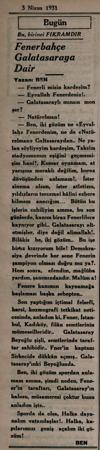 Nazım Hikmet, 1931 yılında, Yeni Gün gazetesinde çıkan "Ben" müstearlı ilk köşe yazısını Fenerbahçeli olmaya dair yazıyor: